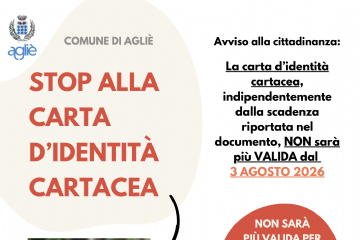 Il Comune di Agliè informa che, a partire dal 3 agosto 2026, le carte d’identità cartacee non saranno più valide per l’espatrio.
