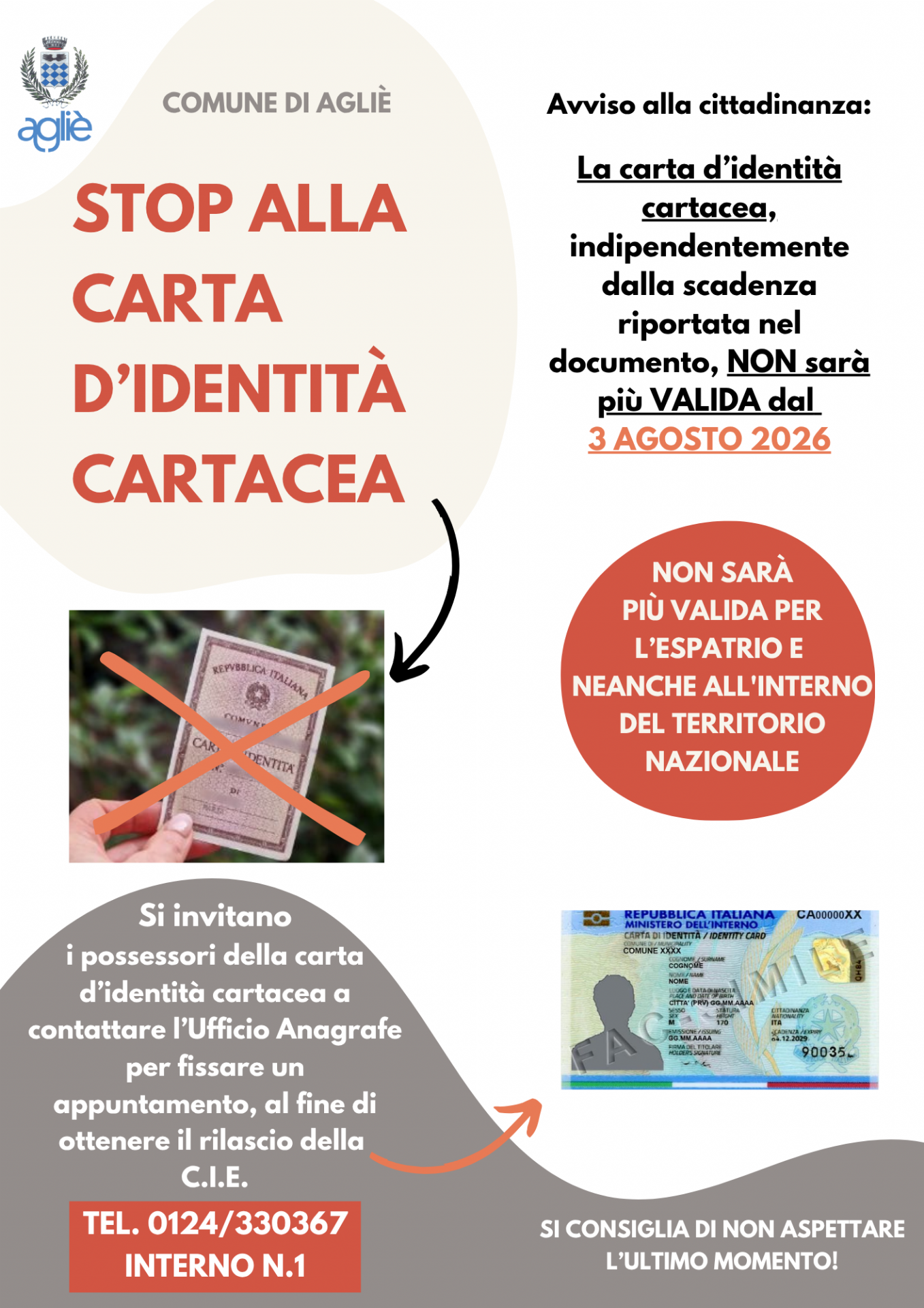 Pertanto, SI INVITANO i possessori della carta d’identità cartacea entro il 3 AGOSTO 2026 a contattare l’Ufficio Anagrafe del Comune di Agliè al n. tel. 0124/330367 interno n.1 per fissare un appuntamento al rilascio della nuova carta d’identità elettronica (C.I.E.).