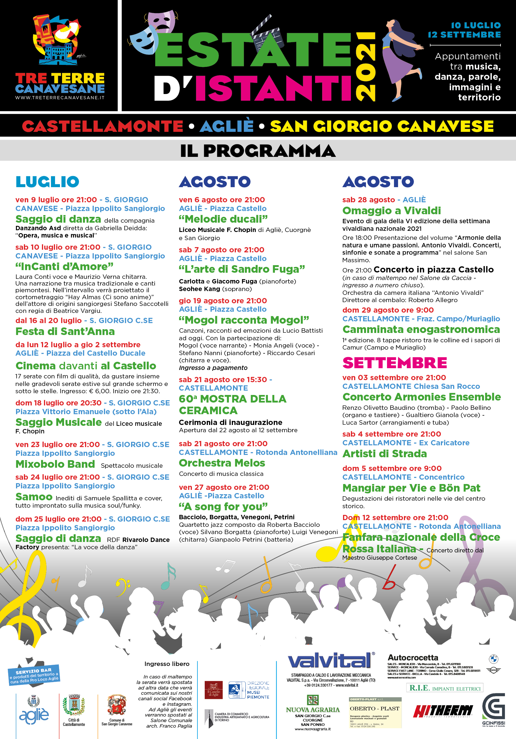 I Comuni di Agliè, Castellamonte e San Giorgio Canavese, nell’ambito del progetto Tre Terre Canavesane, tornano a proporre per il secondo anno un evento coordinato che intende presentare appuntamenti per dare vita alle serate estive nel solco della musica, dello spettacolo, del cinema e del territorio. Dopo il periodo di chiusura per la pandemia si vuole insomma invitare i cittadini a tornare nelle piazze per vivere il paese, anche se sempre rispettando le norme e le distanze di sicurezza, rimanendo dunque distanti, ma al tempo stesso godendo gli istanti di questa estate 2021.
