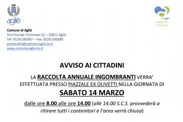 LA RACCOLTA ANNUALE INGOMBRANTI VERRA’ EFFETTUATA PRESSO PIAZZALE EX OLIVETTI NELLA GIORNATA DI