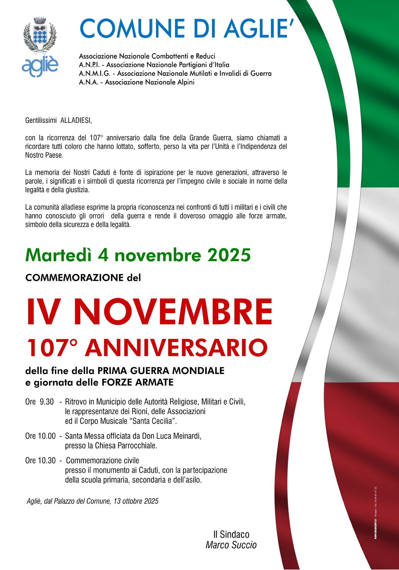 Si comunica che MARTEDI' 4 NOVEMBRE 2025 si celebrerà la ricorrenza del 107° anniversario della fine della prima guerra mondiale e giornata delle forze armate
