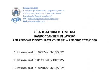 Il Comune di Agliè seleziona n. 2 operatori da inserire nel Cantiere di Lavoro Over 58, finanziato dalla Regione Piemonte.