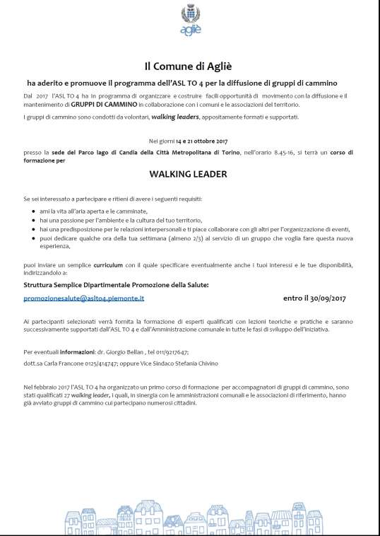 Il Comune di Agliè ha aderito e promuove Il programma dell'ASL TO 4 per la diffusione di gruppi di cammino.