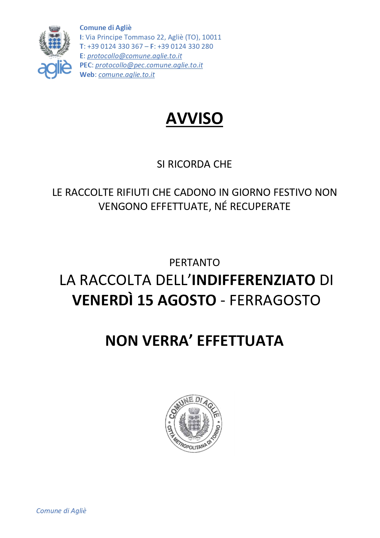 Si ricorda alla popolazione che VENERDI' 15 AGOSTO 2025, essendo un giorno FESTIVO, la ditta S.C.S. non provvederà al ritiro della raccolta indifferenziata.